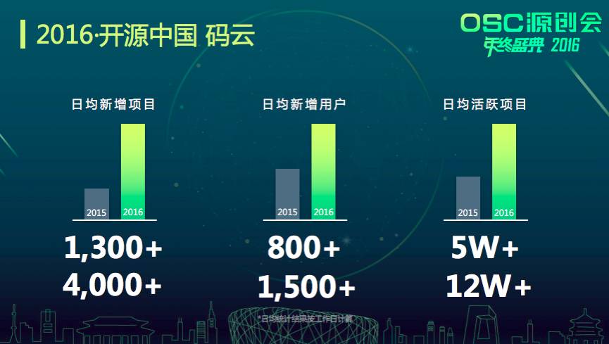 大家知道,三年之前我们推出了著名的码云,这也是向那位活着的老大致敬。码云的增长极其强劲,以至于我们今年兴奋地觉得,我们终于确确实实地通过技术为程序员做了点儿小事。