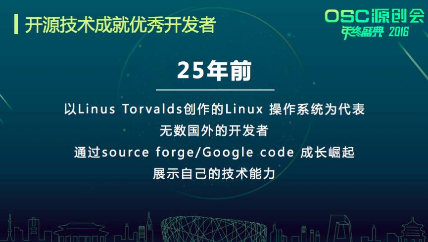 在这里,不得不感谢一位前辈,他的名字叫Linus Torvalds。他说出了我们这个行业的口号:“Talk is cheap,show me the code”。二十五年前,这个人凭借一己之力写了Linux内核。过去的二十多年,因为Linux,形成了一股开源浪潮,国外有了source forge、Google code,有了数以千万计的开源软件,成就了互联网这个伟大行业。